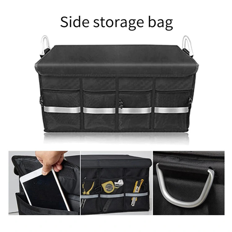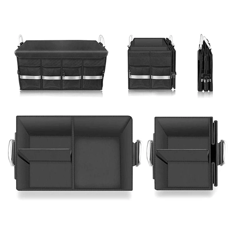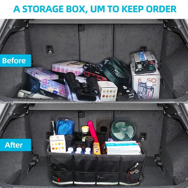 Kolmessa pääosastossa on työkaluja, ruokaa, urheiluvarusteita, puhdistusaineita ja hätätarvikkeita. Neljä verkkopohjaista sivutaskua säilyttävät pieniä tavaroita, kuten pyyhkeitä tai kortteja. Etukannellinen tasku varmistaa kertoimet ja päät. Se sopii kuorma-autoihin, sedaneihin, maastoautoihin, pakettiautoihin ja melkein kaikkiin ajoneuvoihin.