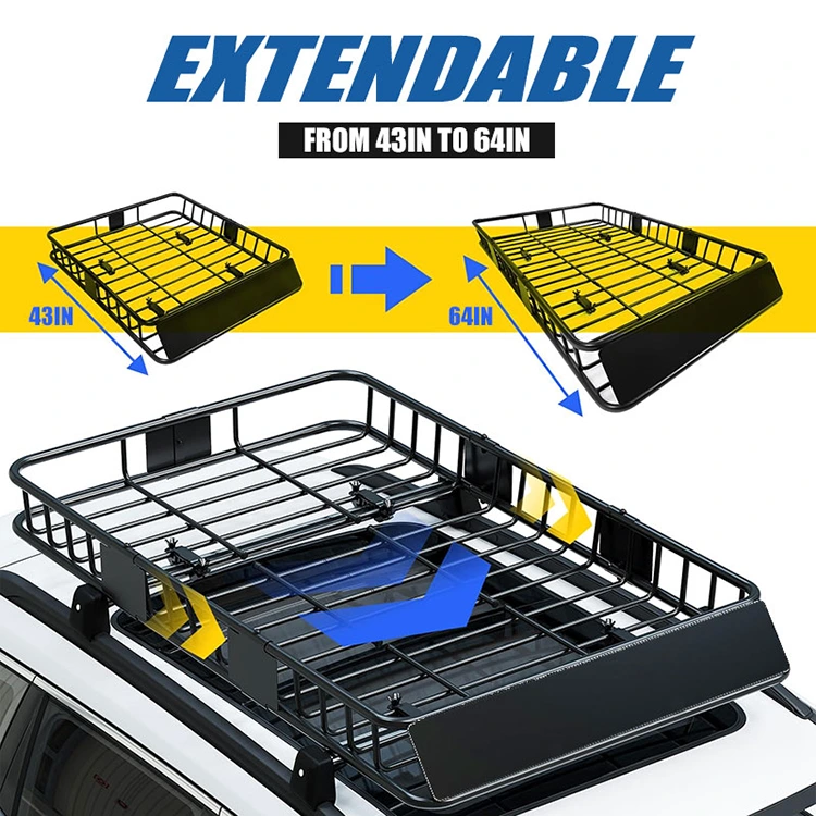 Jatkettava rakenne: Tässä kattotelineen telinekorissa on näppärä jatkettava rakenne – vakiokoko (43" x 39" x 6") kompakteille autoille ja laajennettavissa 64" suurempiin ajoneuvoihin, mikä maksimoi tavaratilan. Kokoontaitettavan muodon ansiosta se on helppo purkaa, kuljettaa ja säilyttää, kun sitä ei käytetä. Se sopii joustaviin matka- ja säilytystarpeisiin.